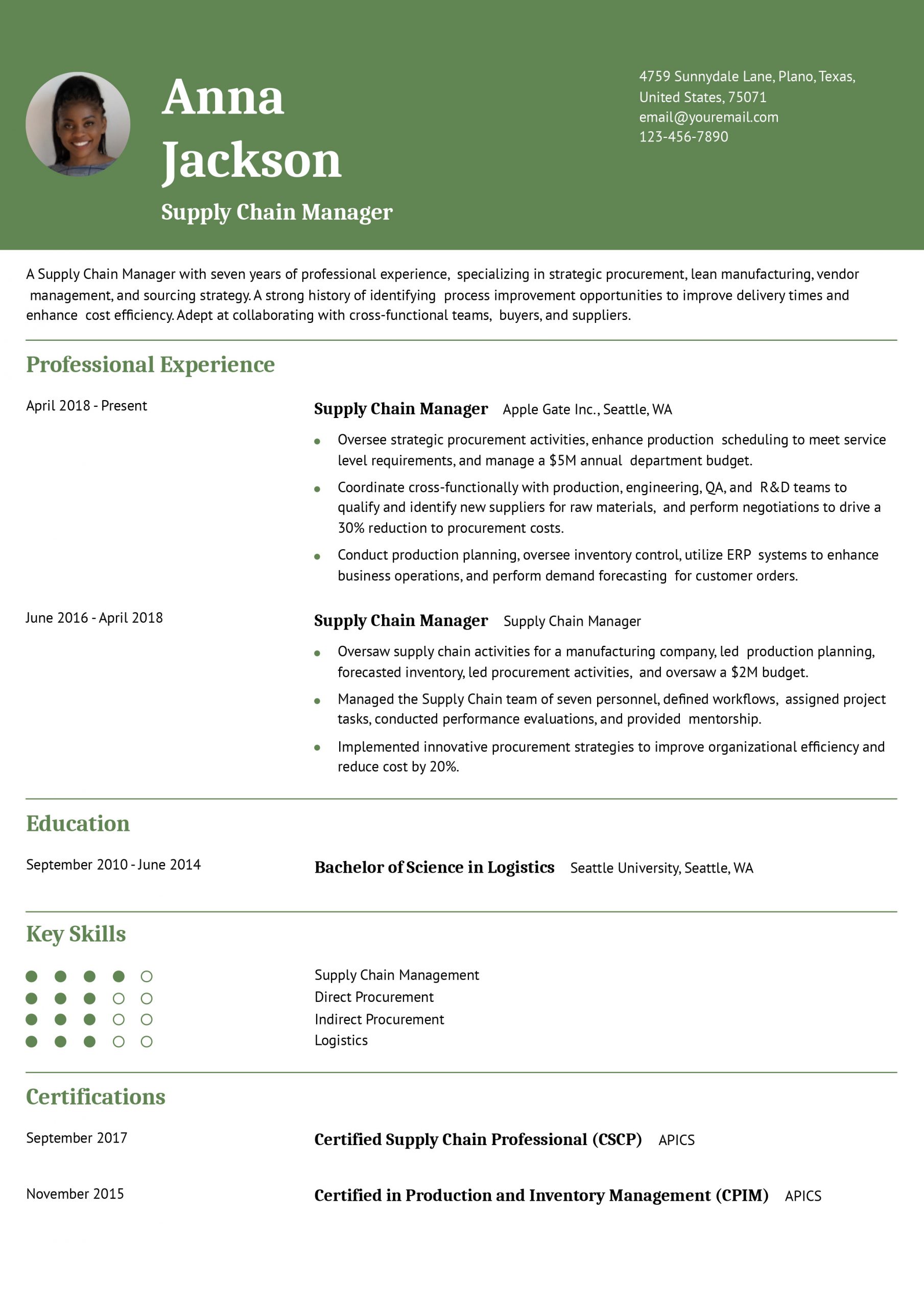Using a resume template can take some guesswork out of creating a supply chain manager resume and ensure you have space for all the important sections, such as your profile summary and professional skills list. When deciding which template to use, look for well-organized designs that are easy to skim and have a clean, neat appearance. Use standard fonts and rely on bolding and bullets for visual separation and maintaining enough white space.