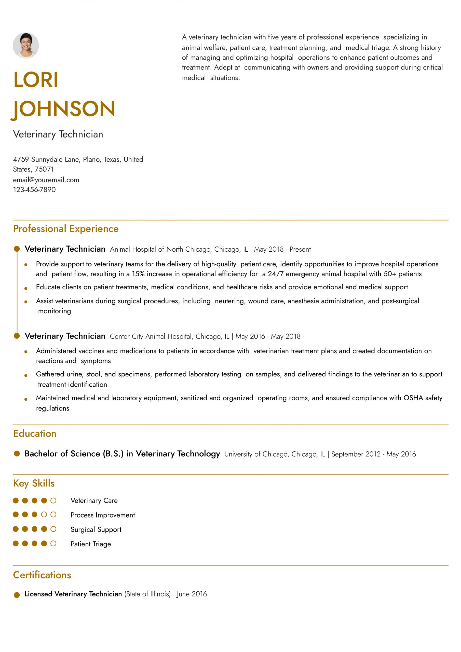 Yes, using a Veterinary Technician resume example can provide guidance on structuring your resume, even if you’re at the beginning of your career. Focus on your internships, education, and skills that are transferable to the job you want. A strong entry-level resume example will highlight your potential and willingness to learn, making your limited experience a benefit.