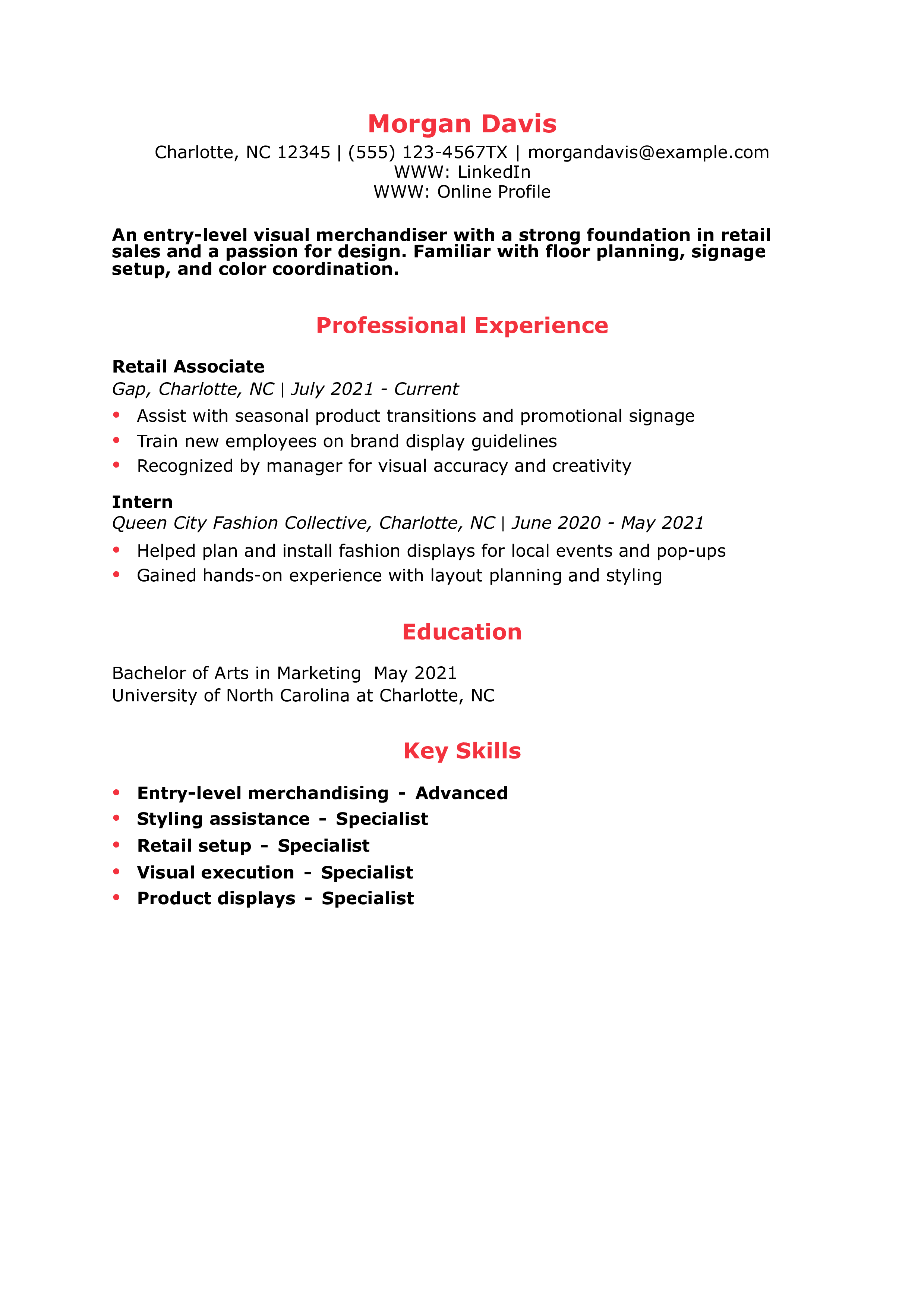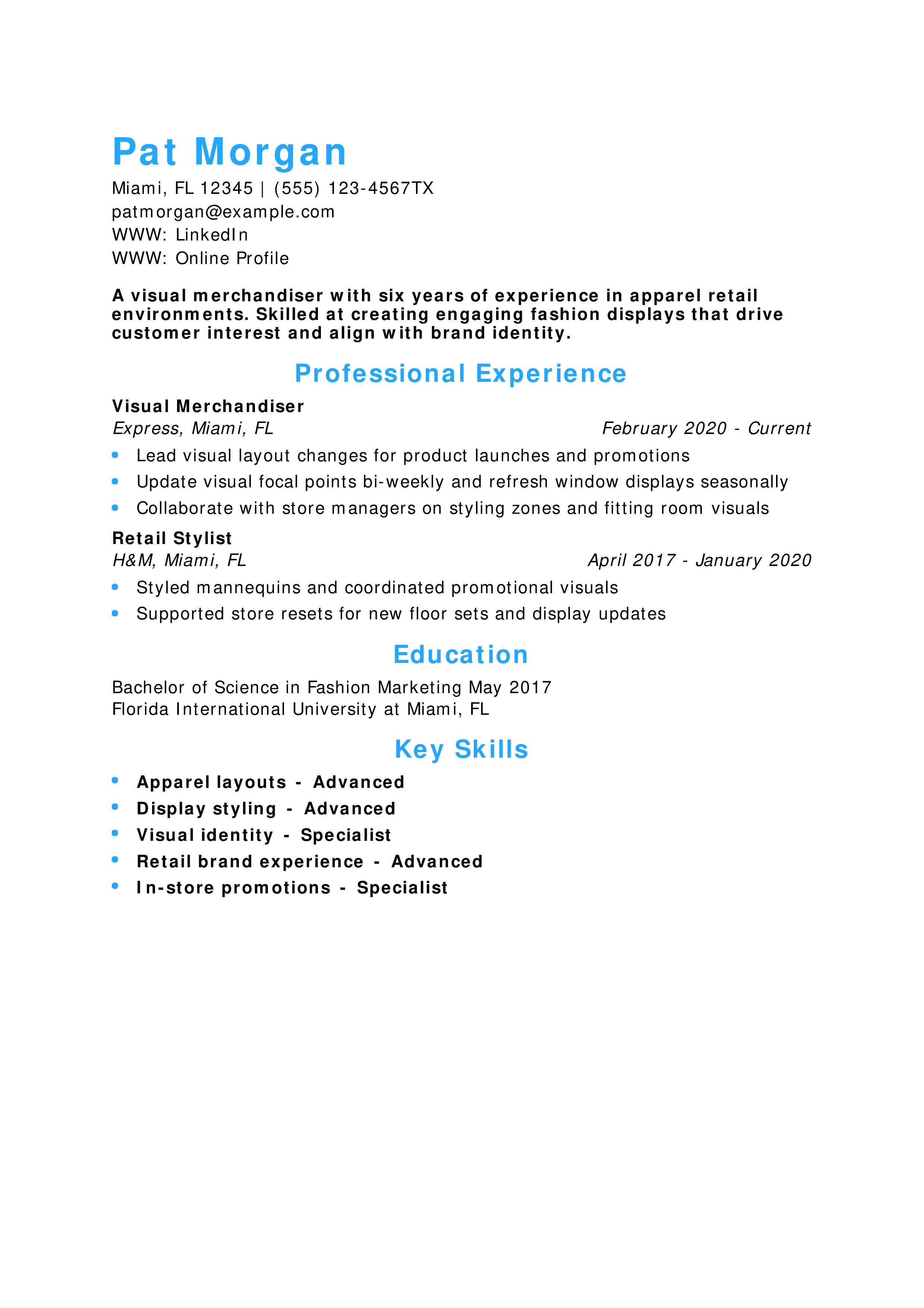 There’s a good chance the companies you’re applying to use an applicant tracking system (ATS) that screens candidate resumes. That’s why your resume must include the pertinent key skills, keywords, and phrases the hiring manager is looking for. It’s a good idea to look at the job description and mirror some of the same key terms and skills into your resume. Here are some examples of skills often included in visual merchandising job postings: