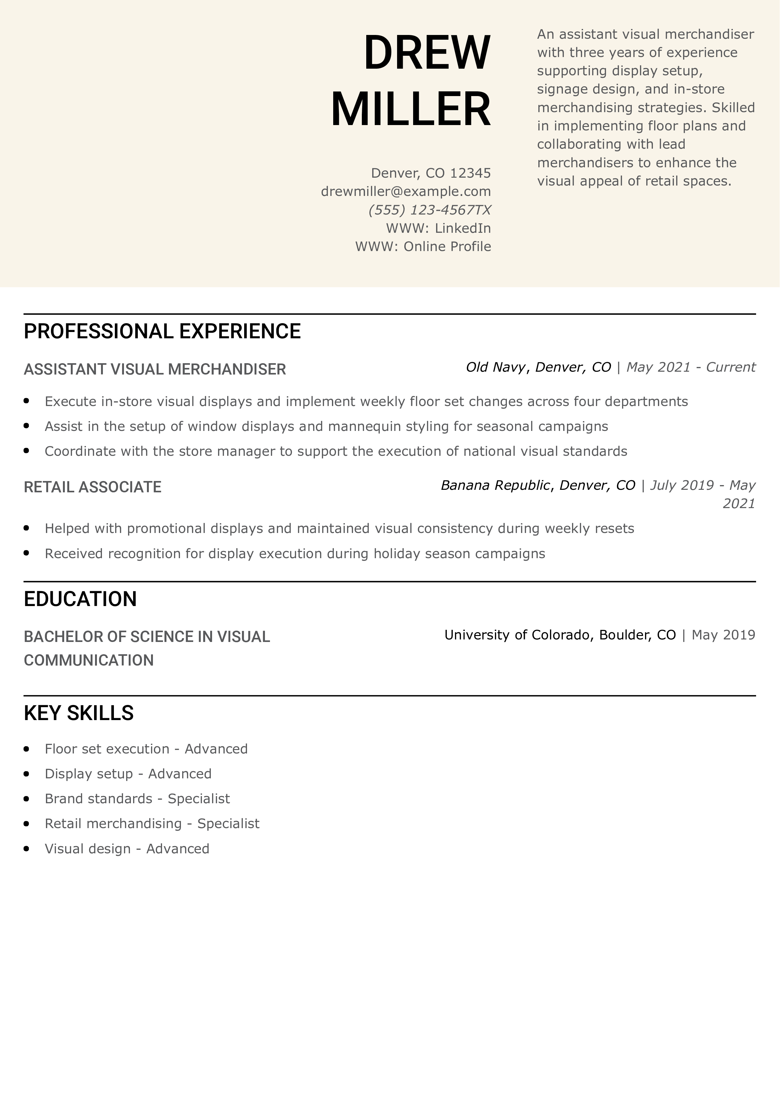 A visual merchandiser with entry-level experience, specializing in merchandising, graphic design, print production, and visual marketing. Adept at coordinating with marketing teams to develop, implement, and maintain high-impact retail displays to maximize product sales.