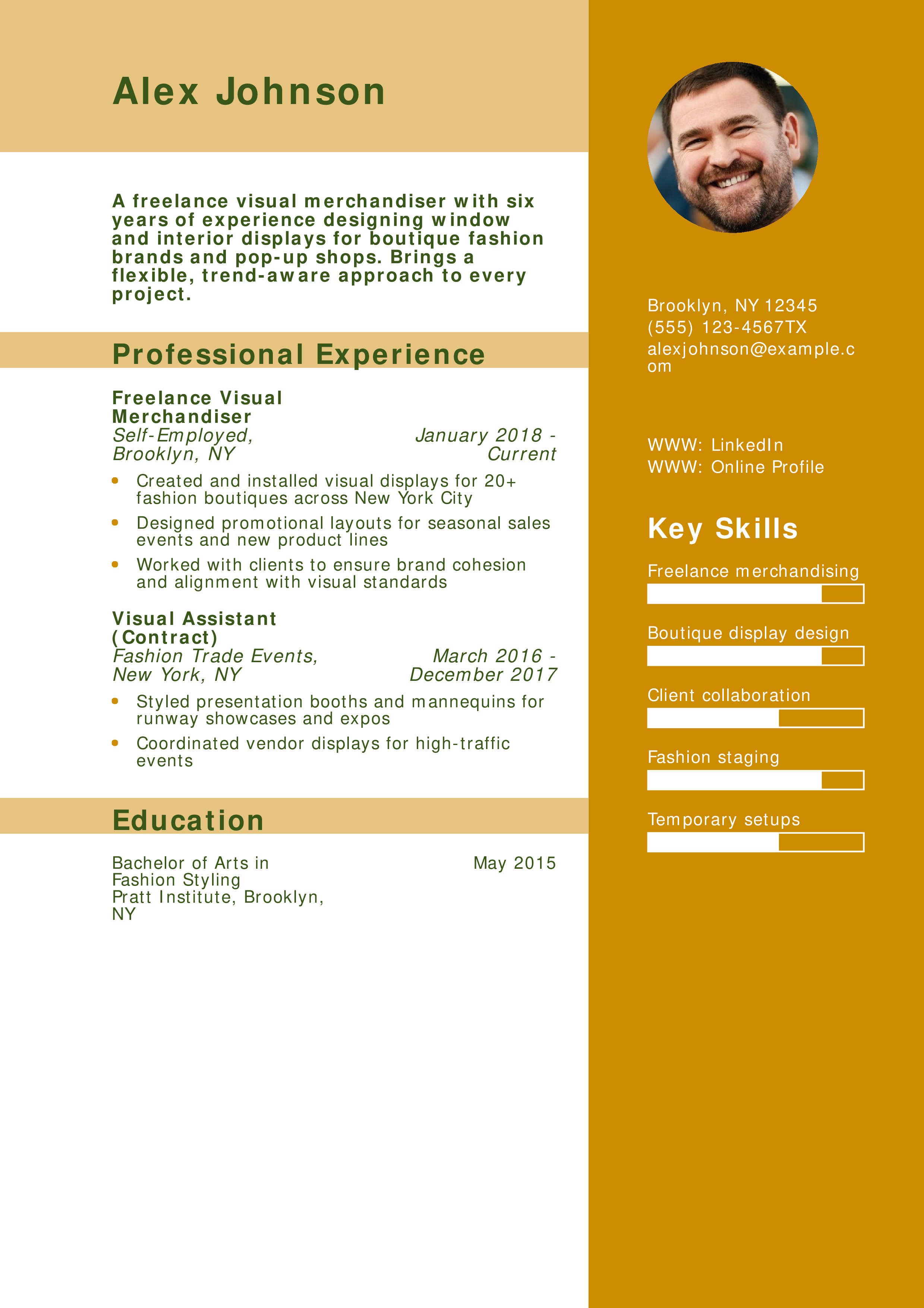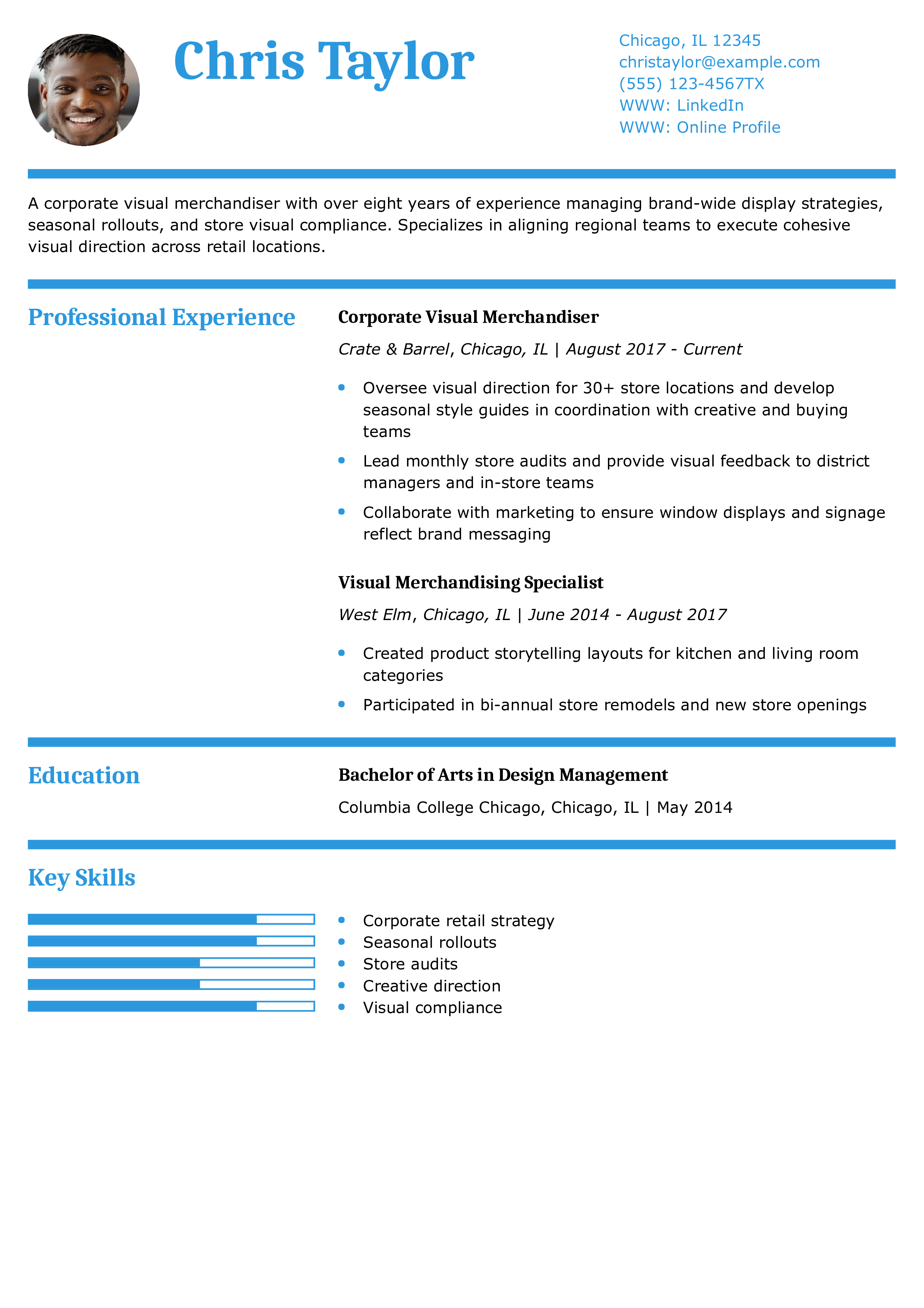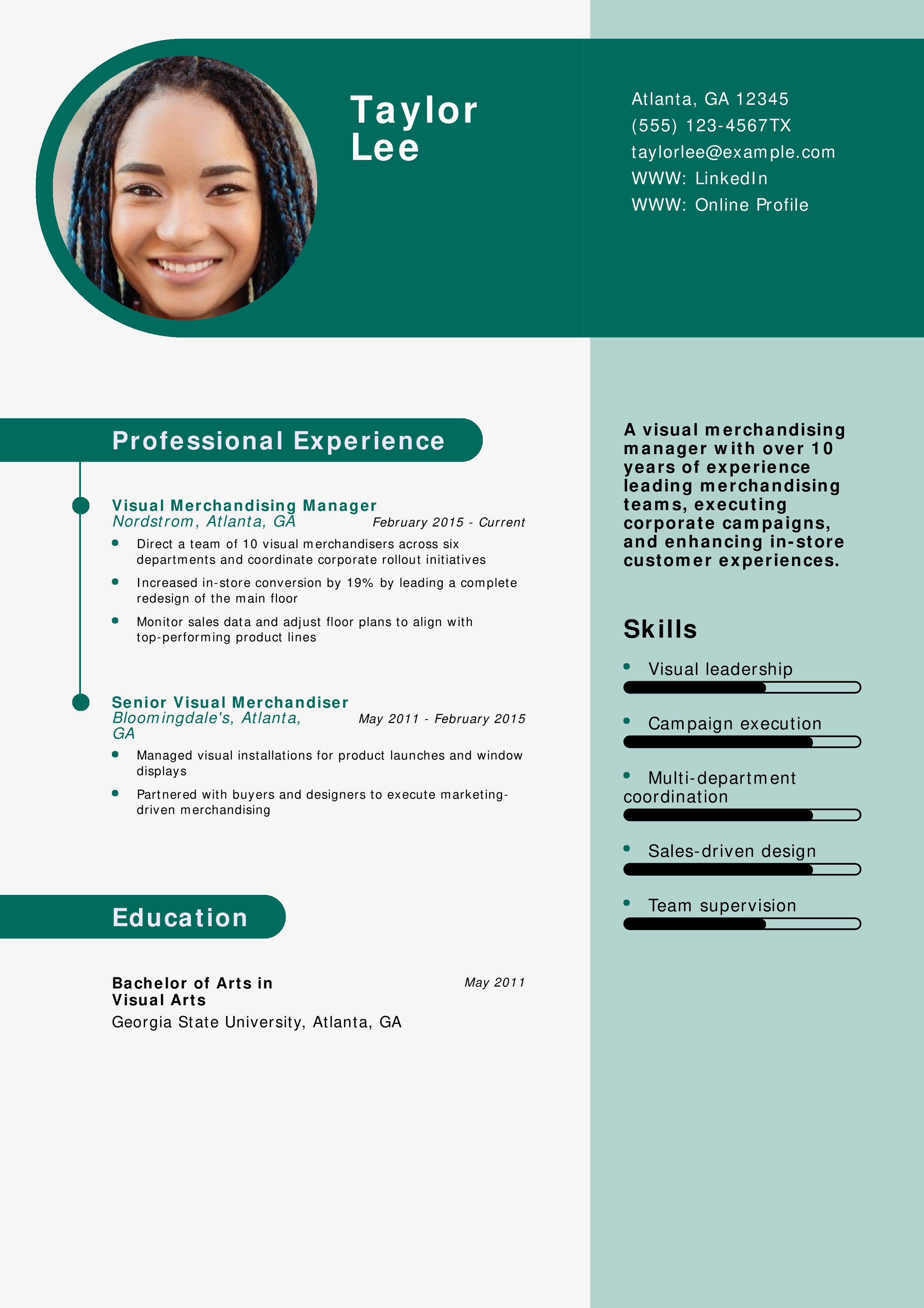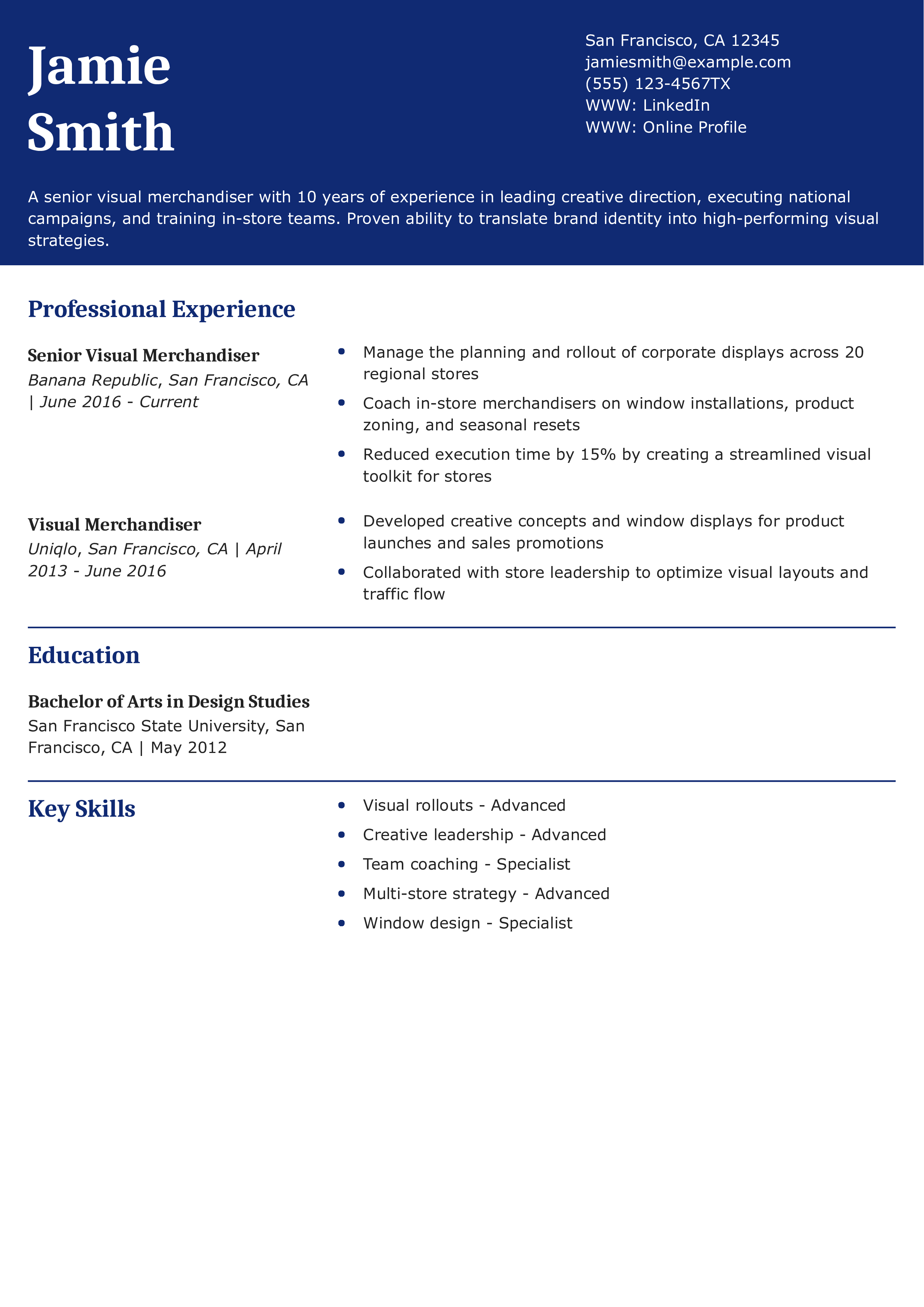 This resume is good because it focuses on high-traffic retail success and emphasizes alignment with corporate visual standards. To learn more about structuring resumes for creative roles, visit how to make a resume.