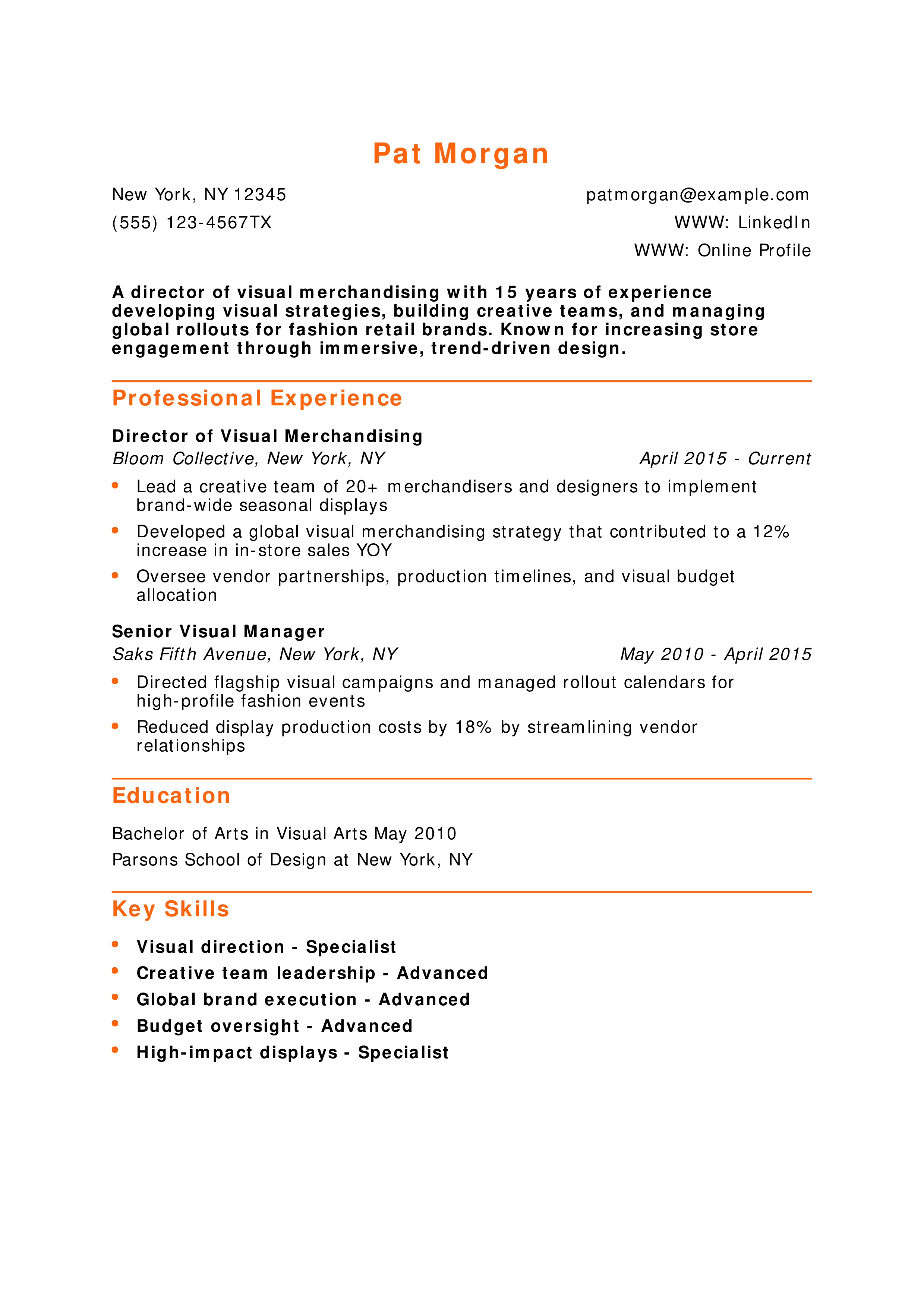 This resume is good because it emphasizes emotional buying through lifestyle design, which is key in the home goods space. Learn more about what to include in specialized resumes at what to put on a resume.