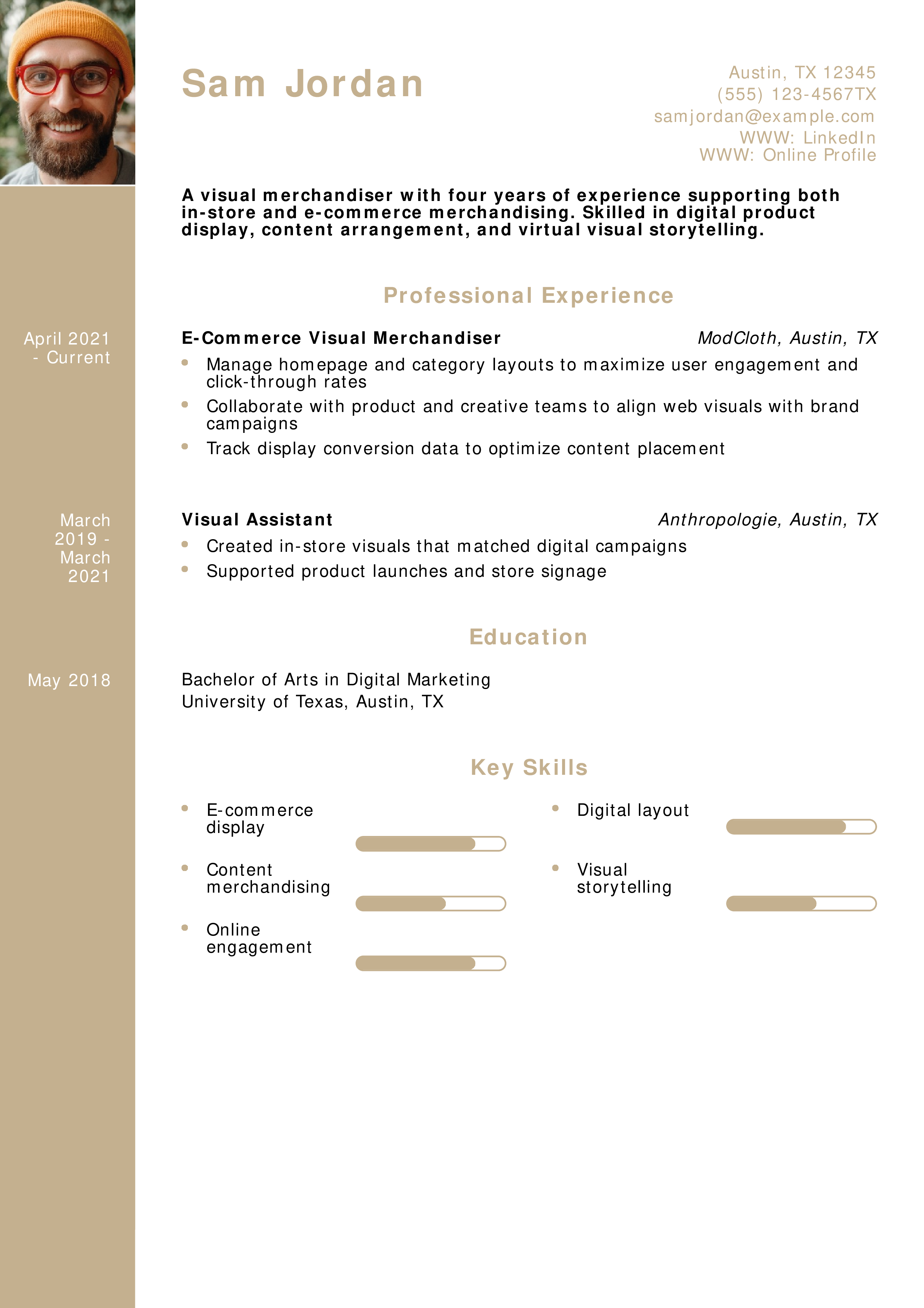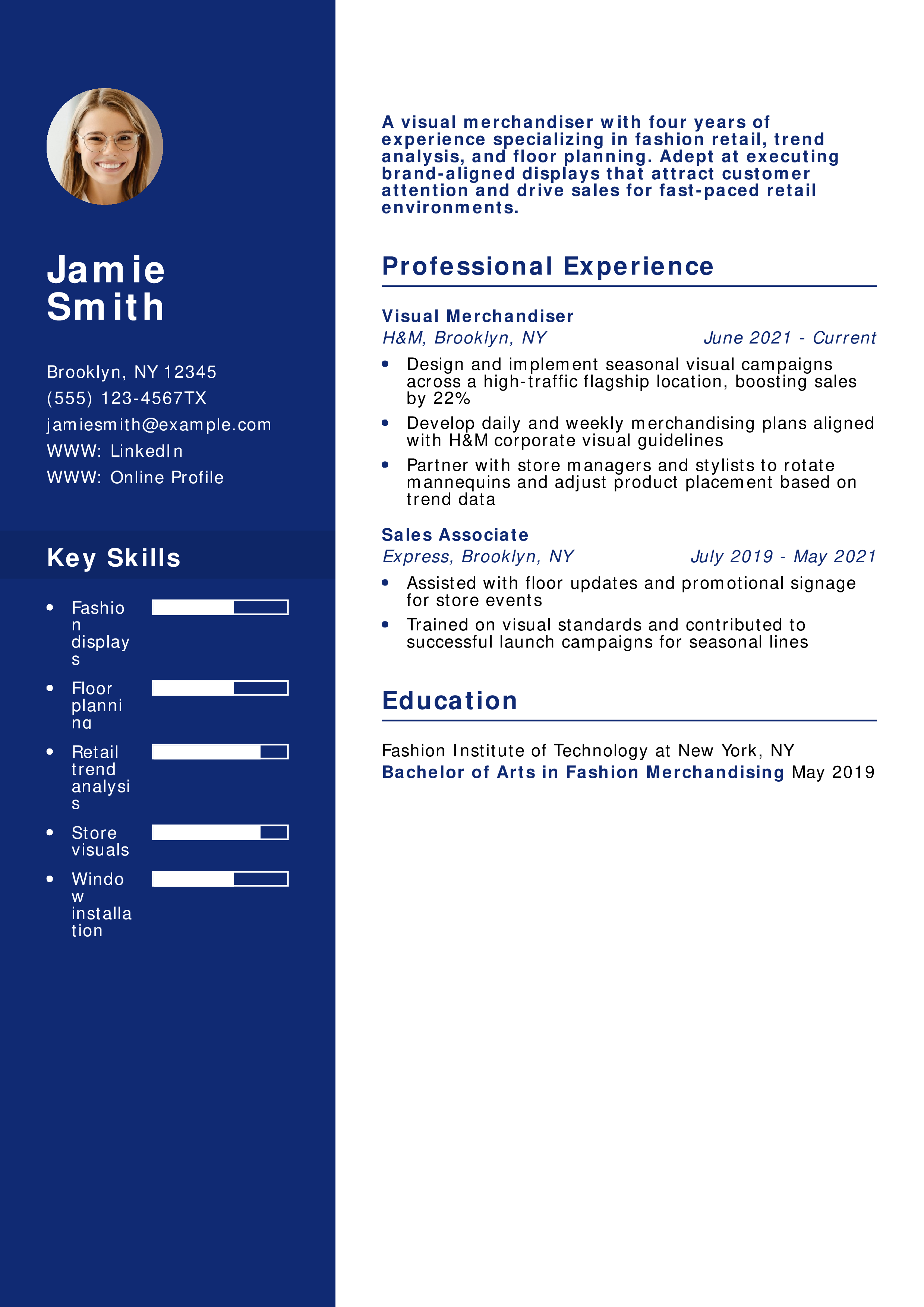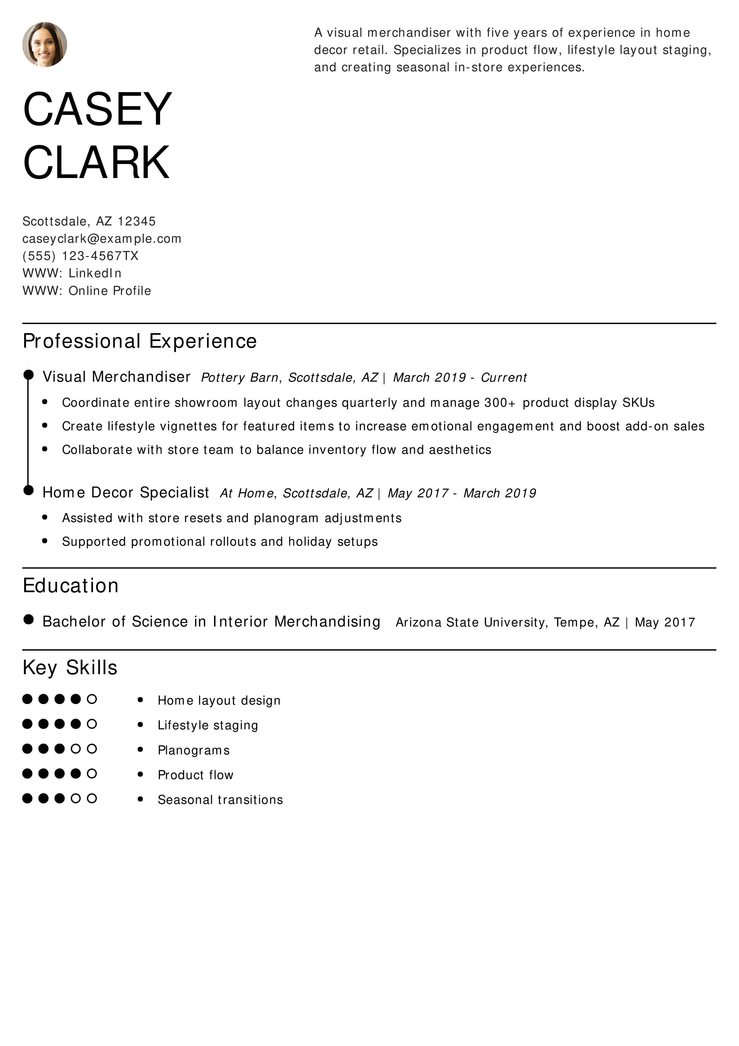 This resume is good because it bridges physical retail and digital merchandising, an essential skill set in modern visual roles. Learn how to highlight tech-forward roles by visiting technical skills for resume.