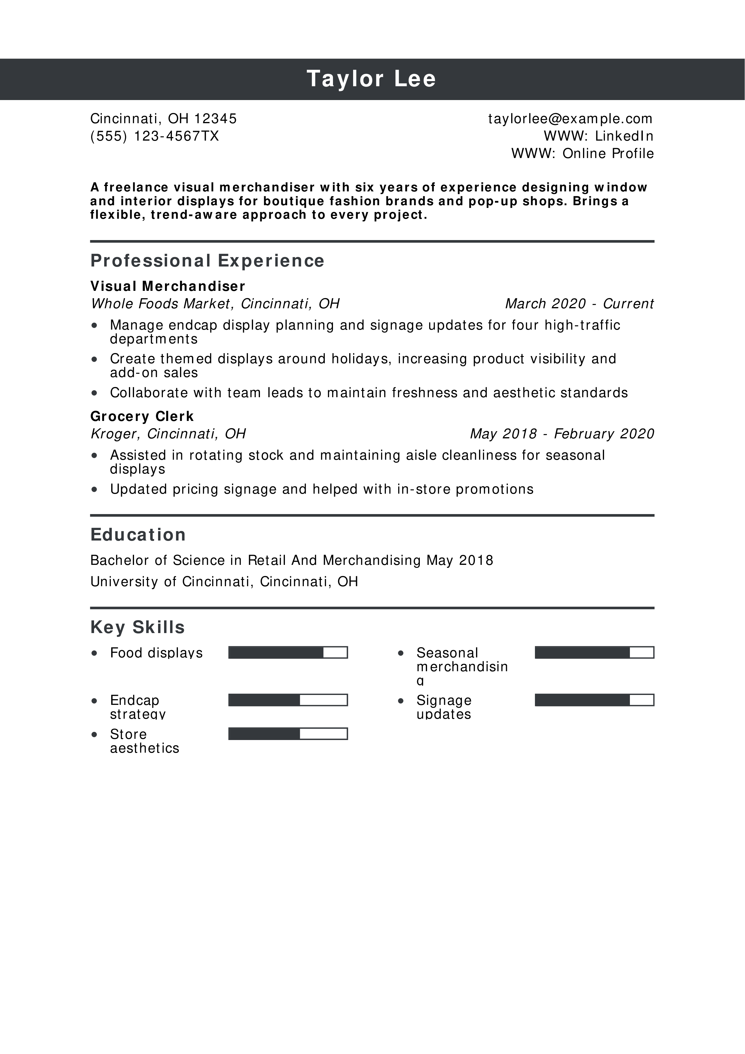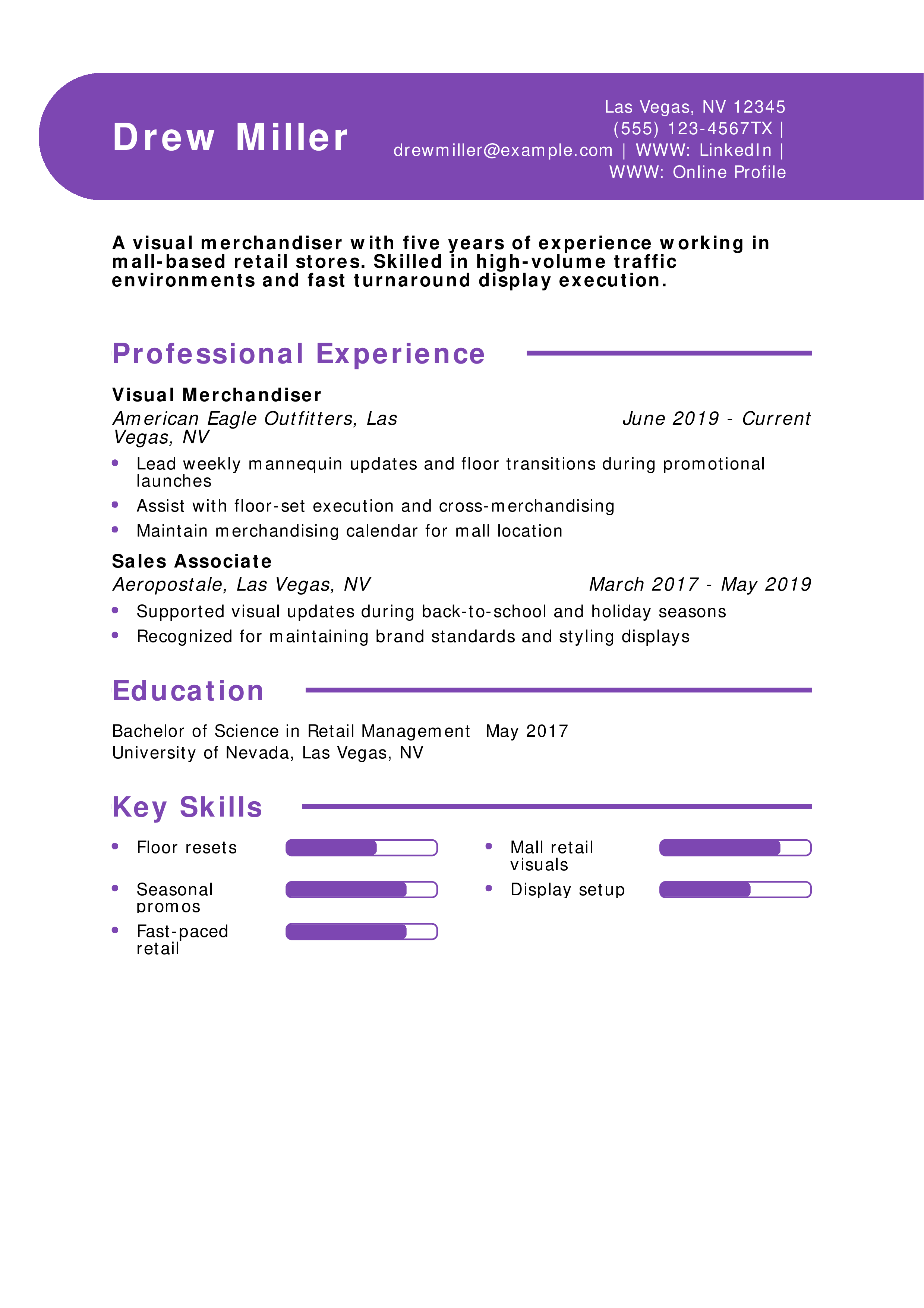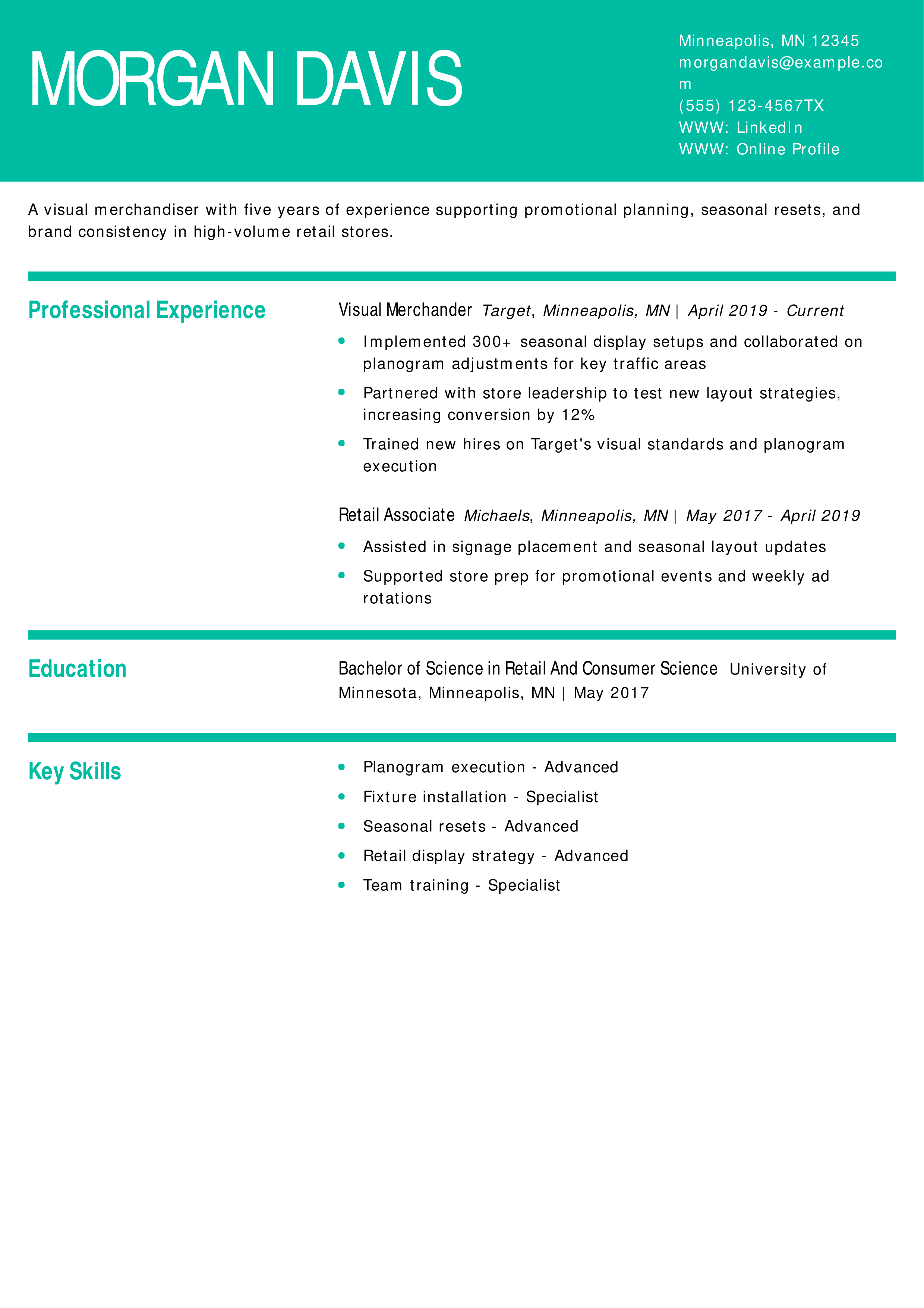 To choose the best visual merchandising resume, ensure it’s easy to read, crisp, and clean. Because the role has creative and design aspects, getting a little creative with the look is OK – just don’t go overboard with colors or graphics. The main focus should be on your accomplishments and qualifications.