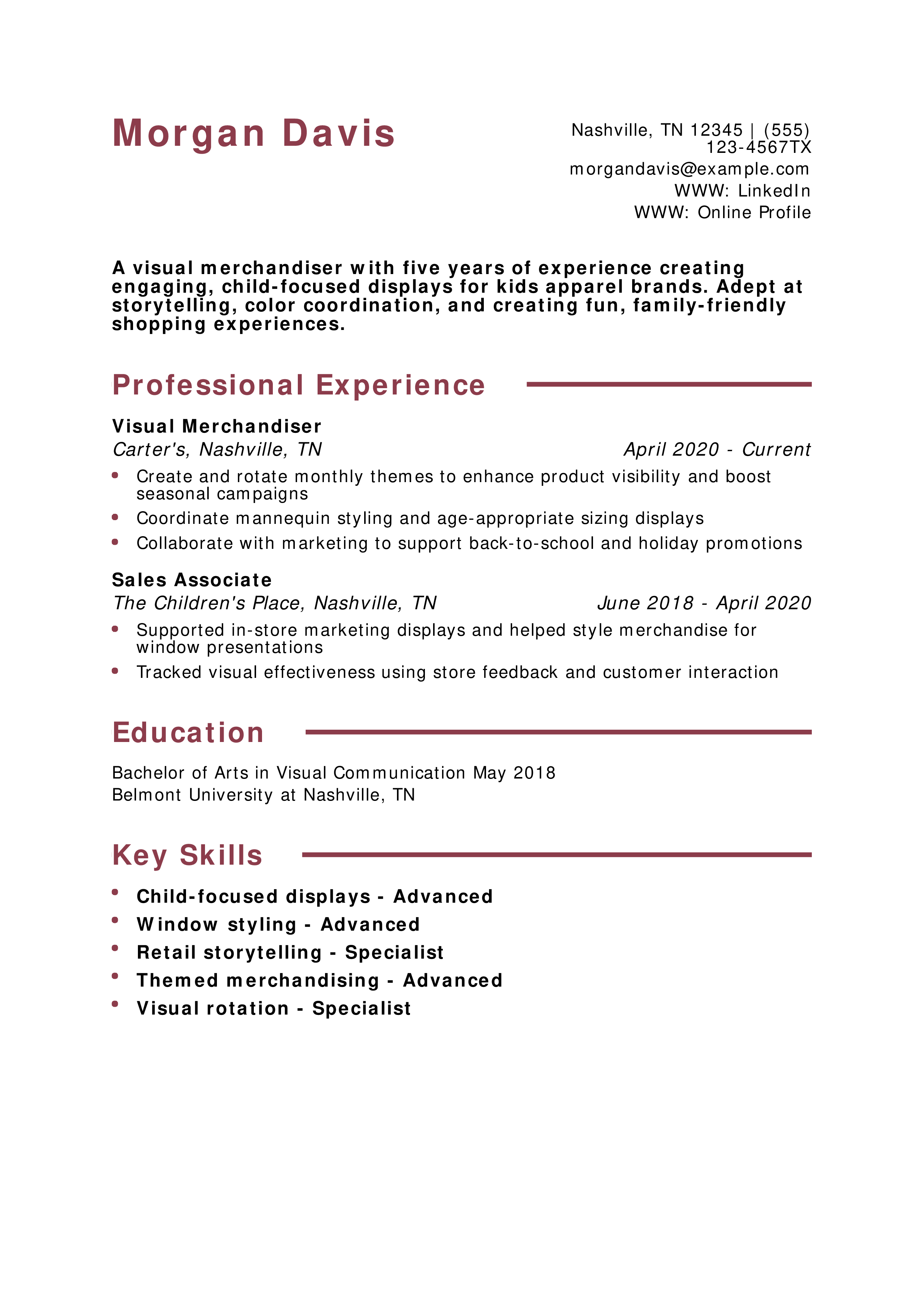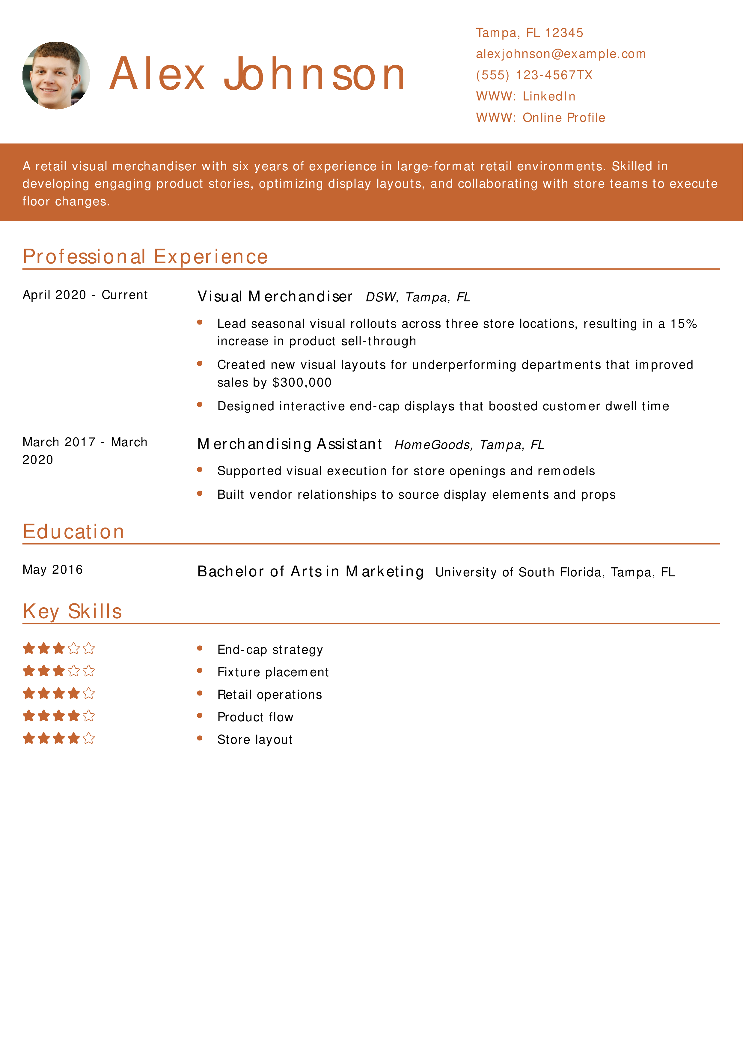 “Visual merchandising resumes should showcase creativity, brand alignment, and sales impact. Show how your displays influence customer behavior. ”