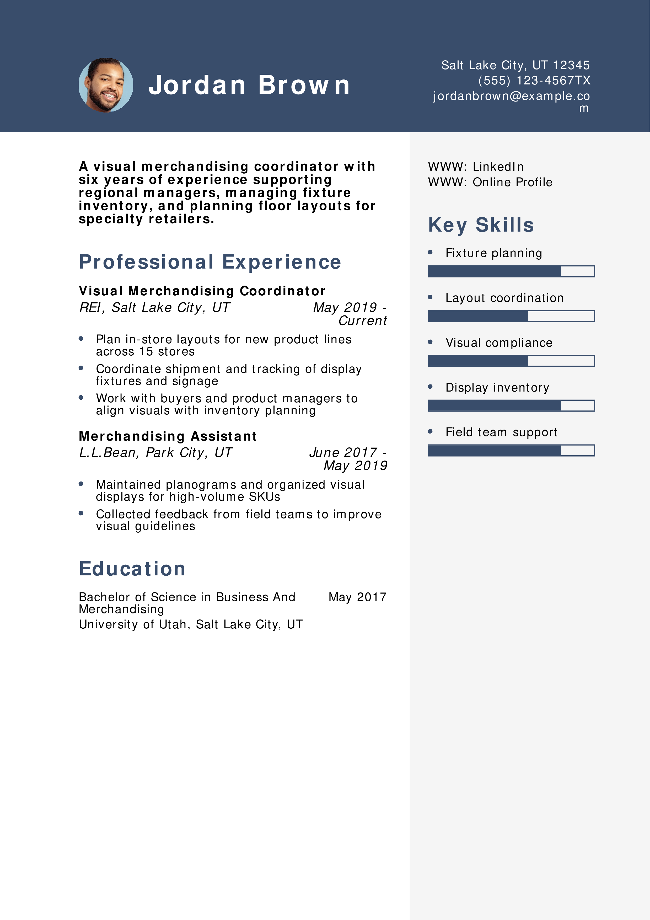 This resume is good because it demonstrates visual strategy in a non-fashion retail setting, showing how merchandising applies across industries. See how to structure similar resumes at resume outline examples.