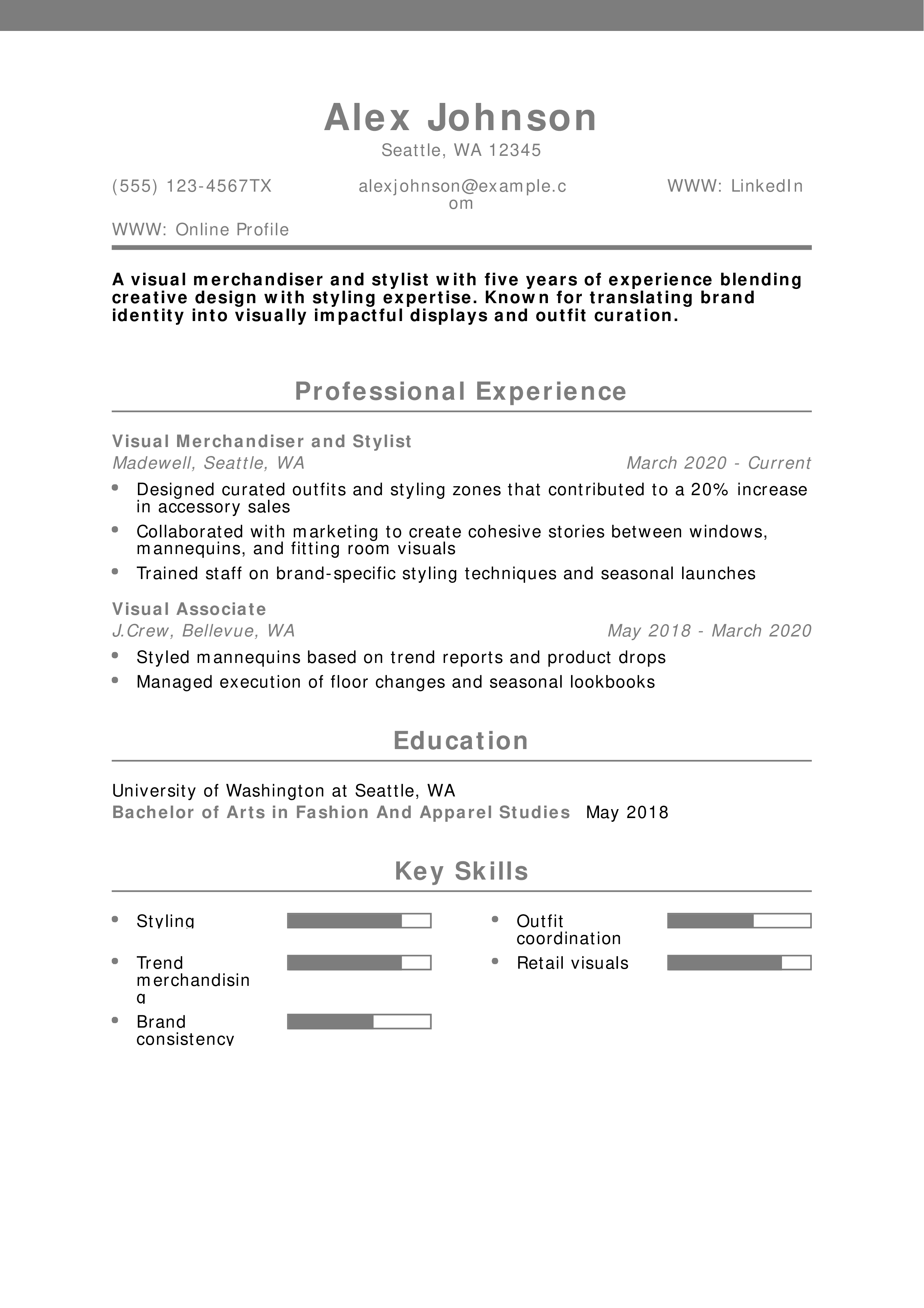 This resume is good because it merges styling and merchandising into one compelling narrative. For advice on communicating multi-skilled roles, read resume skills.