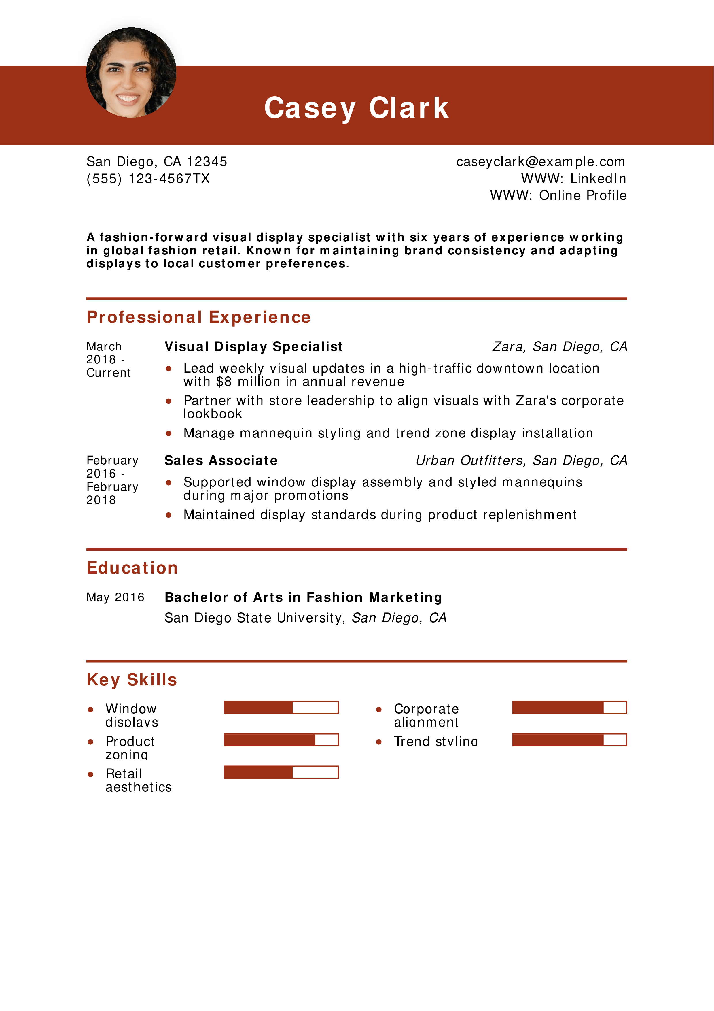 This resume is good because it highlights retail experience and strong creative potential without overloading the entry-level background. Learn how to format entry-level content at how to list relevant coursework on a resume.