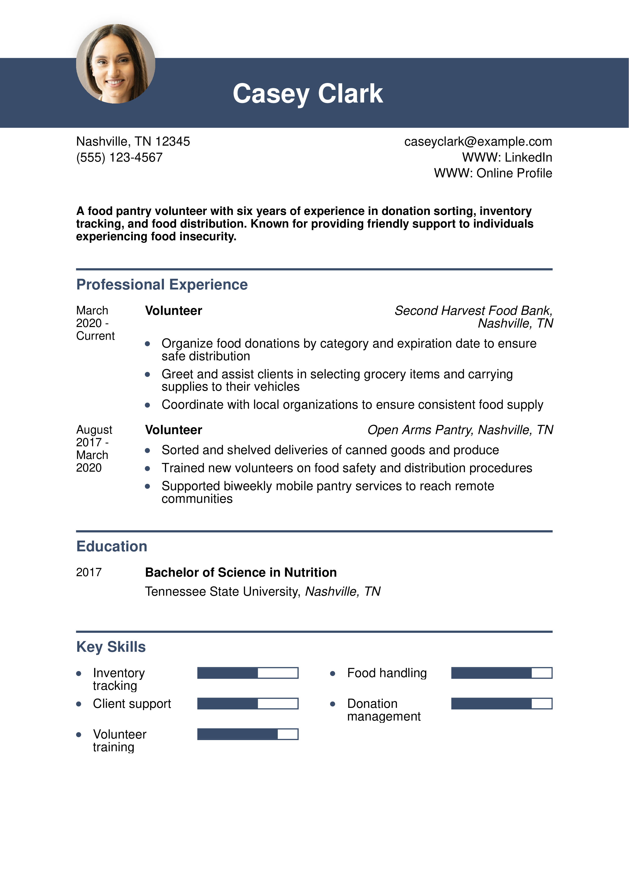 This resume reflects the candidate’s long-term commitment to food access and safety. Learn more about organizing similar volunteer roles at How To Put Volunteer Work on a Resume.