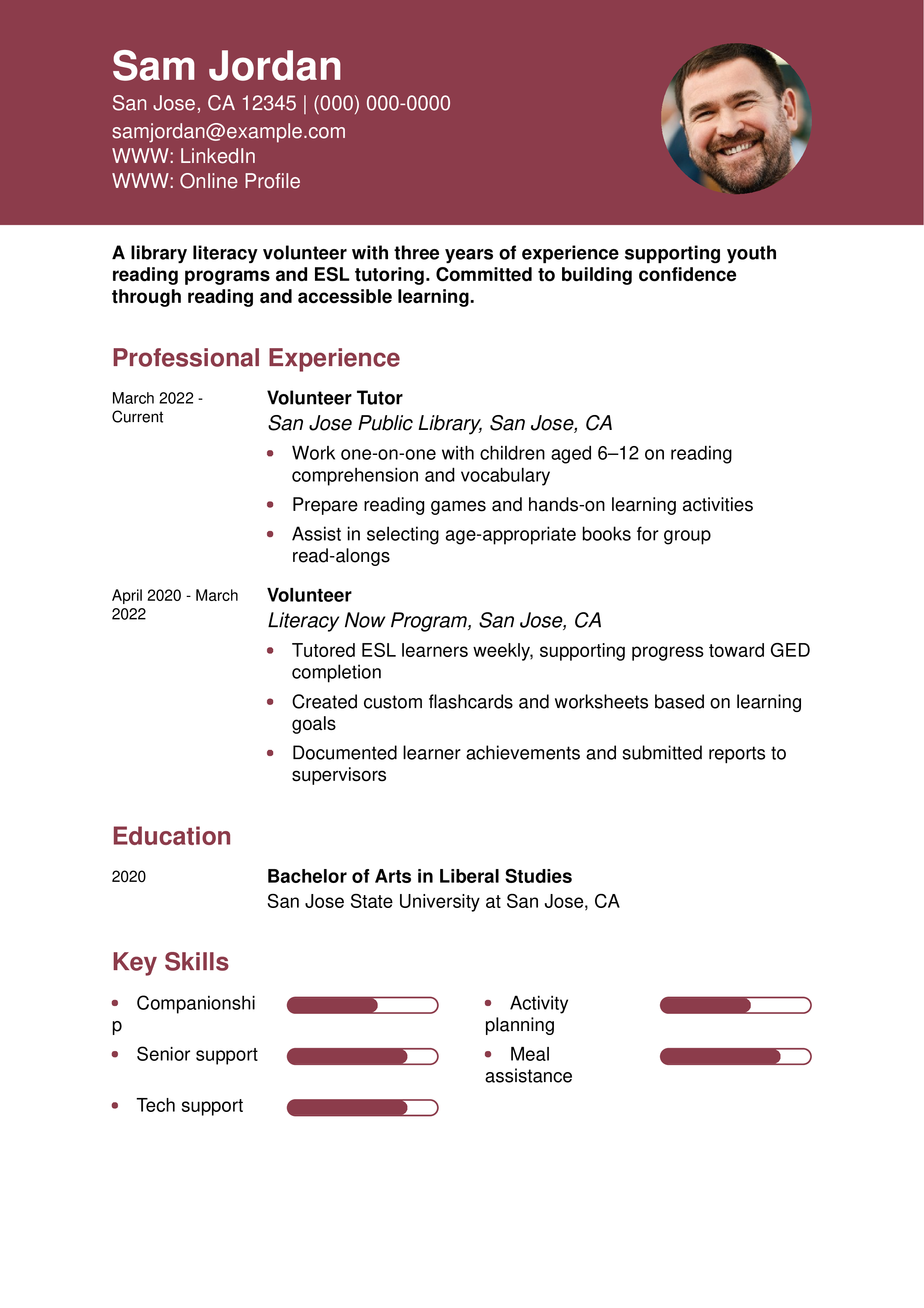 This resume clearly outlines a history of consistent volunteer work in literacy and education. For more tips on building a professional layout, see How To Email a Resume.