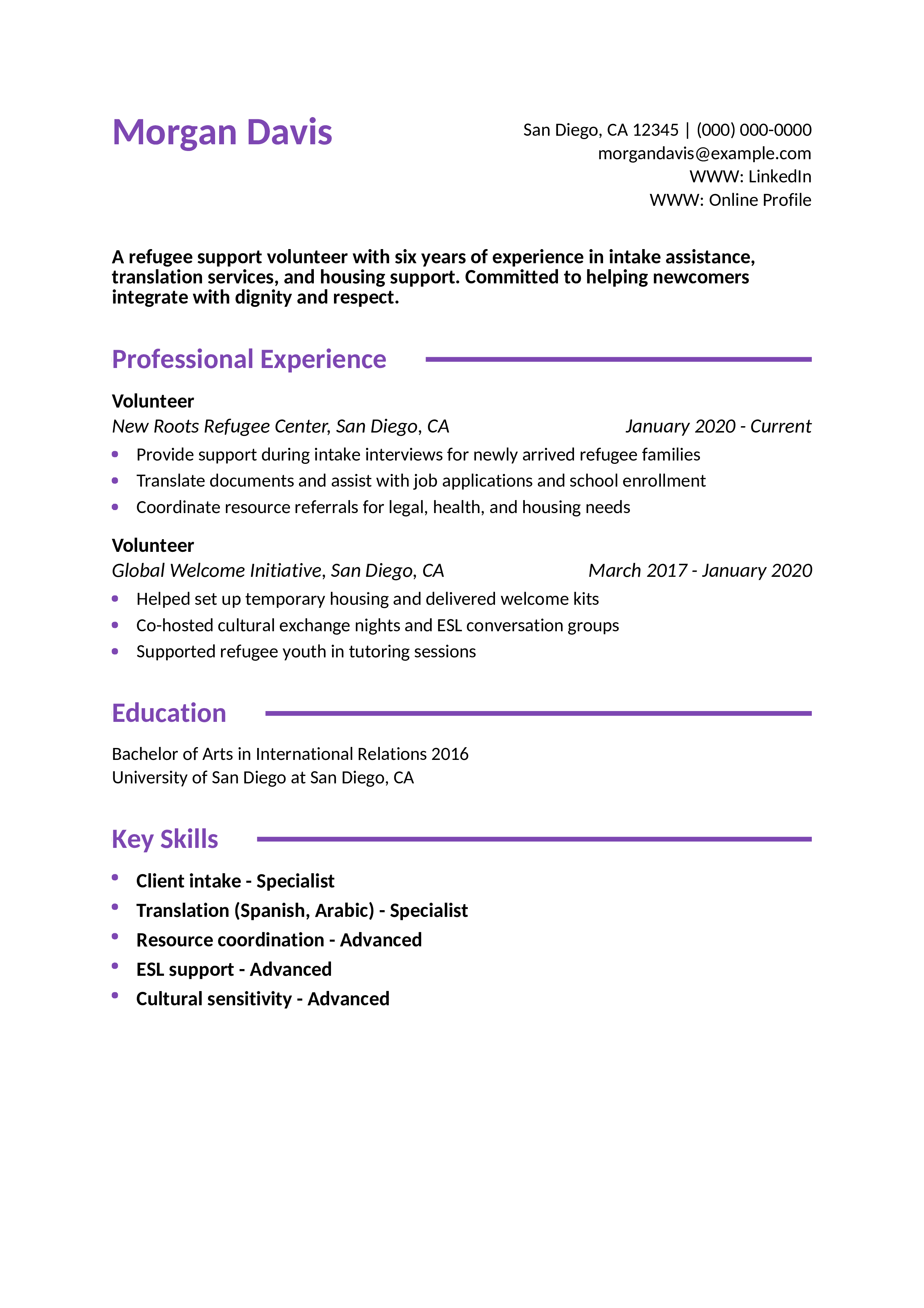 Refugee Support Volunteer Resume