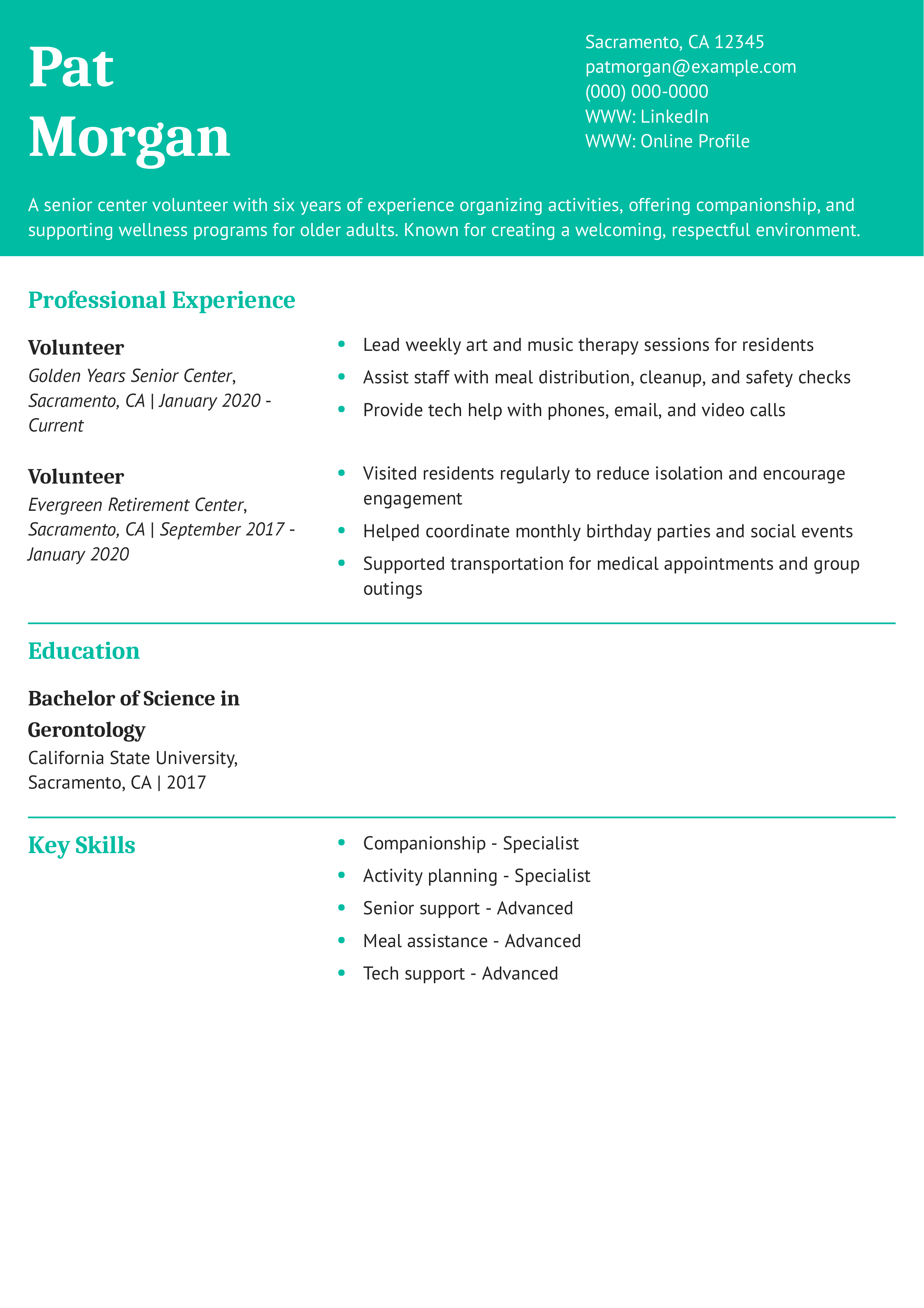 Senior Center Volunteer Resume